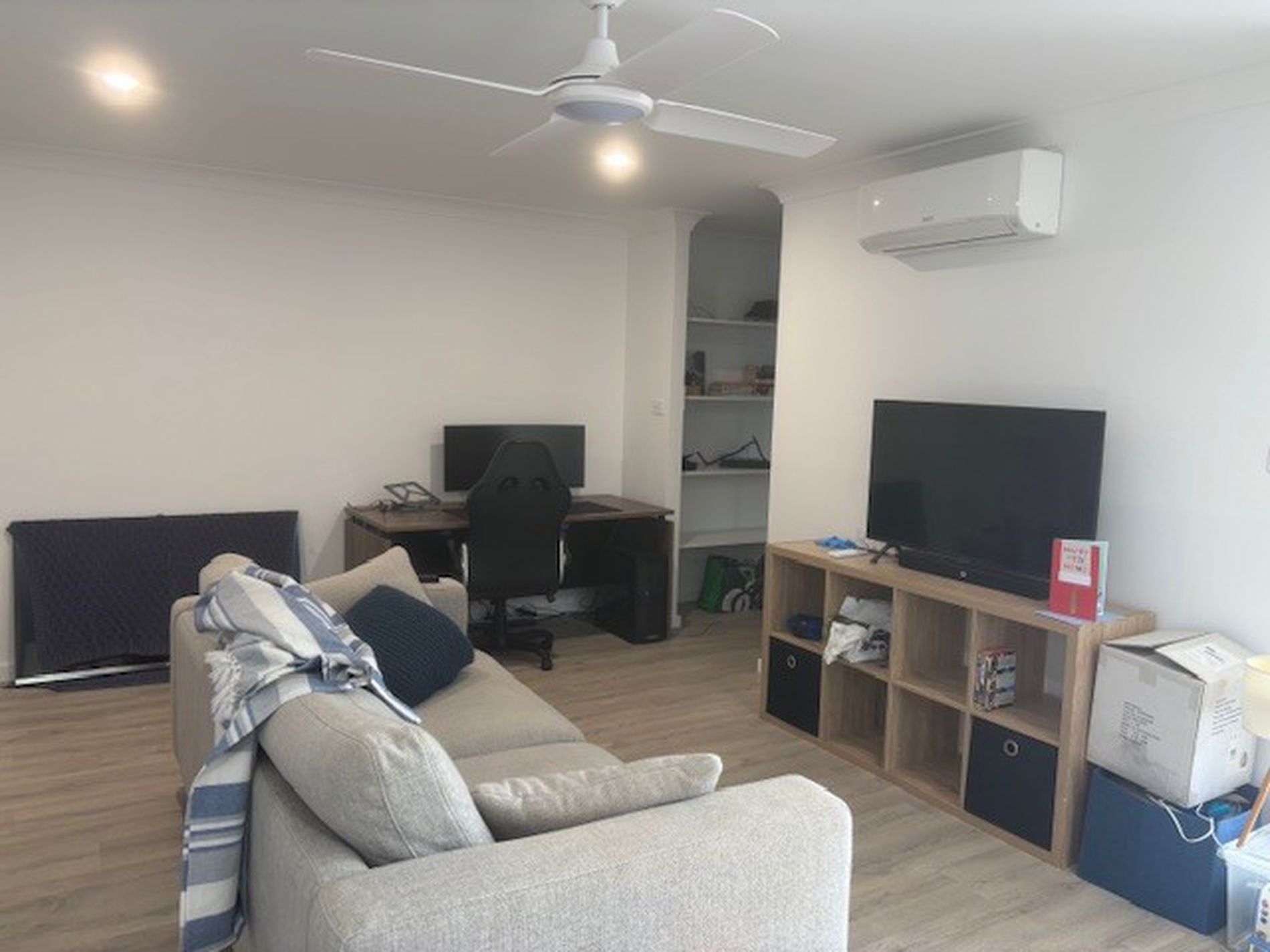- 1 carpeted bedroom with built-in and ceiling fan